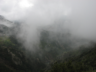 Der gestrige Regen hat den in der Lorbeerwaldzone zu dieser Jahreszeit ohnehin sehr rutschigen Wegen arg zugesetzt (immerhin ist noch "Winter") - ein Großteil der Strecke war mehr eine abgefahrene Schlammschlacht als eine gemütliche Waldwanderung. Wie gut dachte ich, dass ich gestern meine Wanderstiefel eingewachst habe. Jetzt sehen sie wieder aus wie Sau. Mit dem schweren Rucksack auf den Hüften musste ich außerdem ganz schön aufpassen, nicht auszurutschen und mich komplett einzusauen bzw. große Teile des Abstiegsweges auf dem Hintern zu verbringen. Das wäre ein zweifelhaftes Vergnügen gewesen. Im Wald wurde es außerdem noch ziemlich nass von "oben". Tja, die Blätter der Gagelbäume (Myrica faya) und die Sabinas (Wacholderbäume, hier eher Nadeln) waren tropfnass. Die Durchquerung der zahlreichen "Hohlwege" (umsäumt mit den genannten Bäumen) war verbunden mit einer unfreiwilligen Dusche. Der Rucksack, ich und (wieder mal) meine Schuhe von innen - alles klatschnass. Den größten Teil des Höhenwegs lief ich zudem in dichten Nebel.